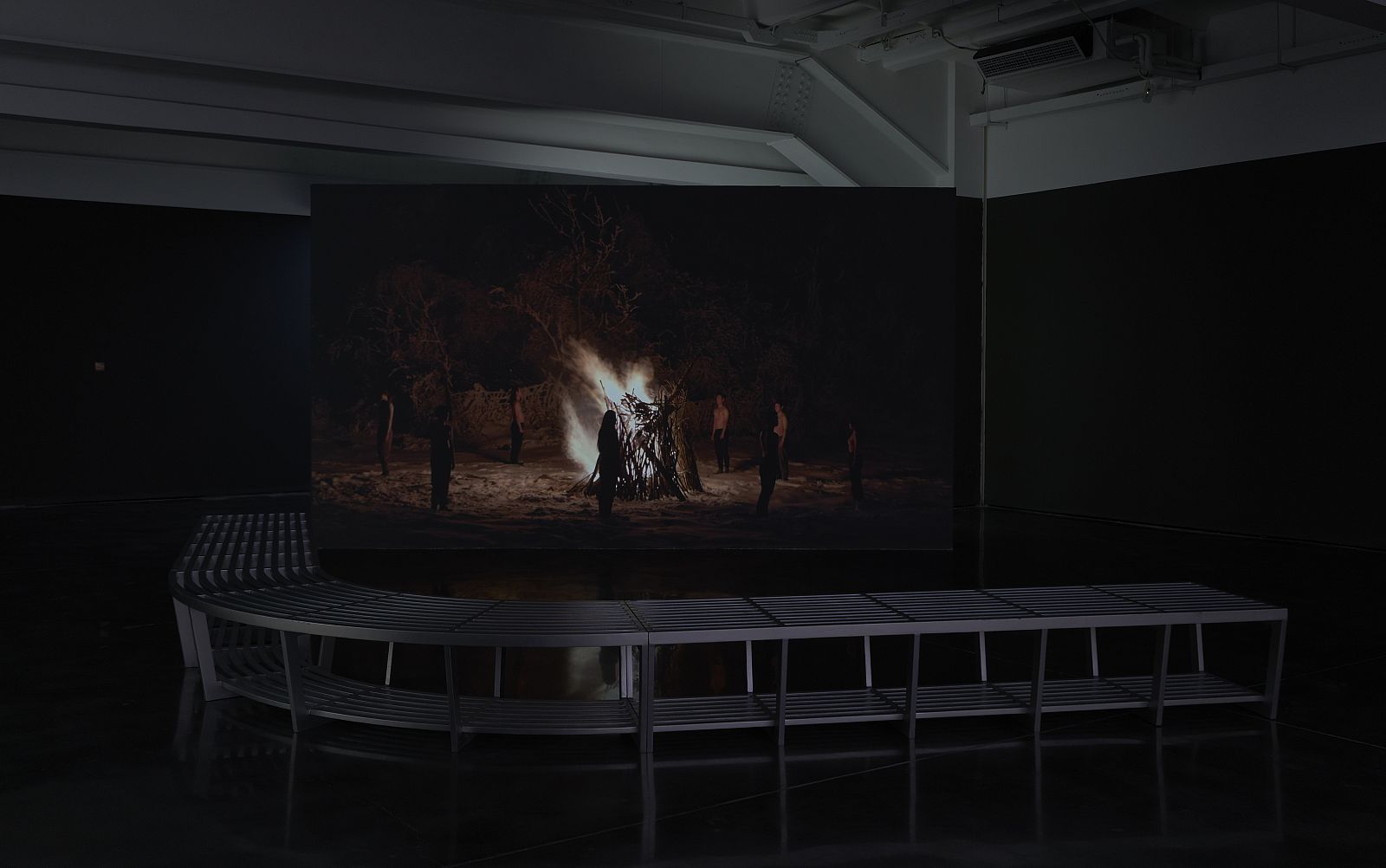On a snowy night, a group of nude people slowly walk toward a bonfire, then spin based on their sense of the temperature.