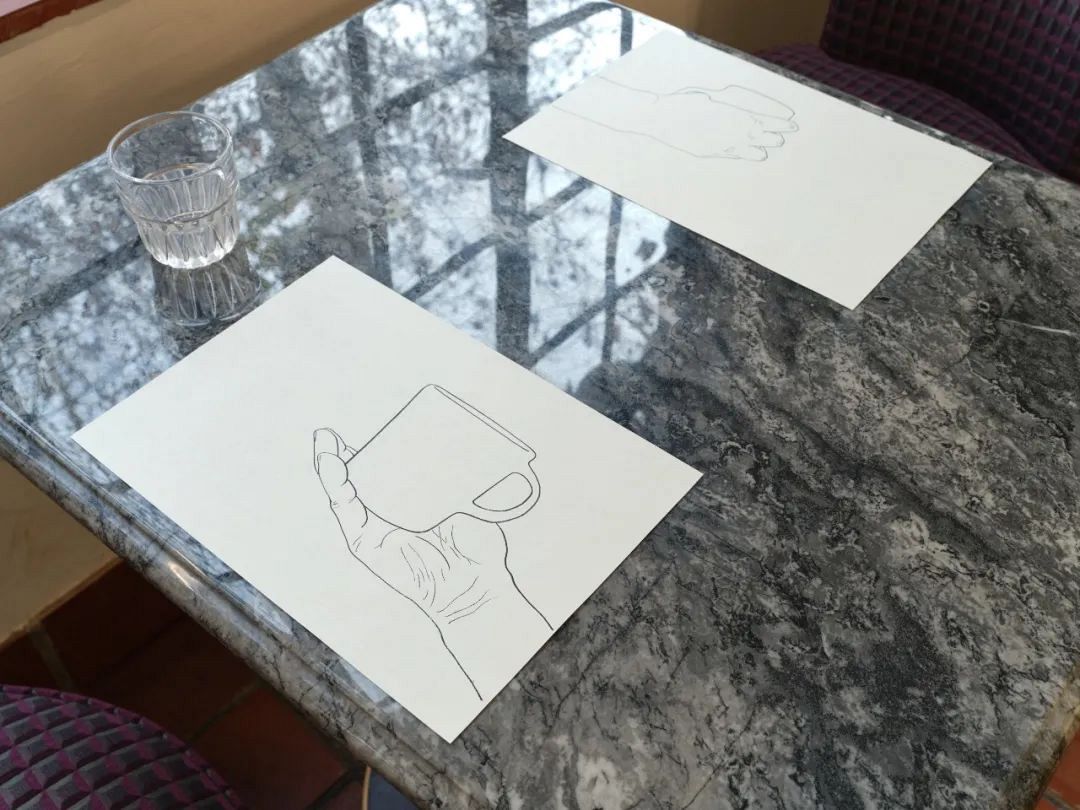Liao Fei, "Holding a Cup", Prints on paper (dispossable placemats), dimensions variable, 2021
