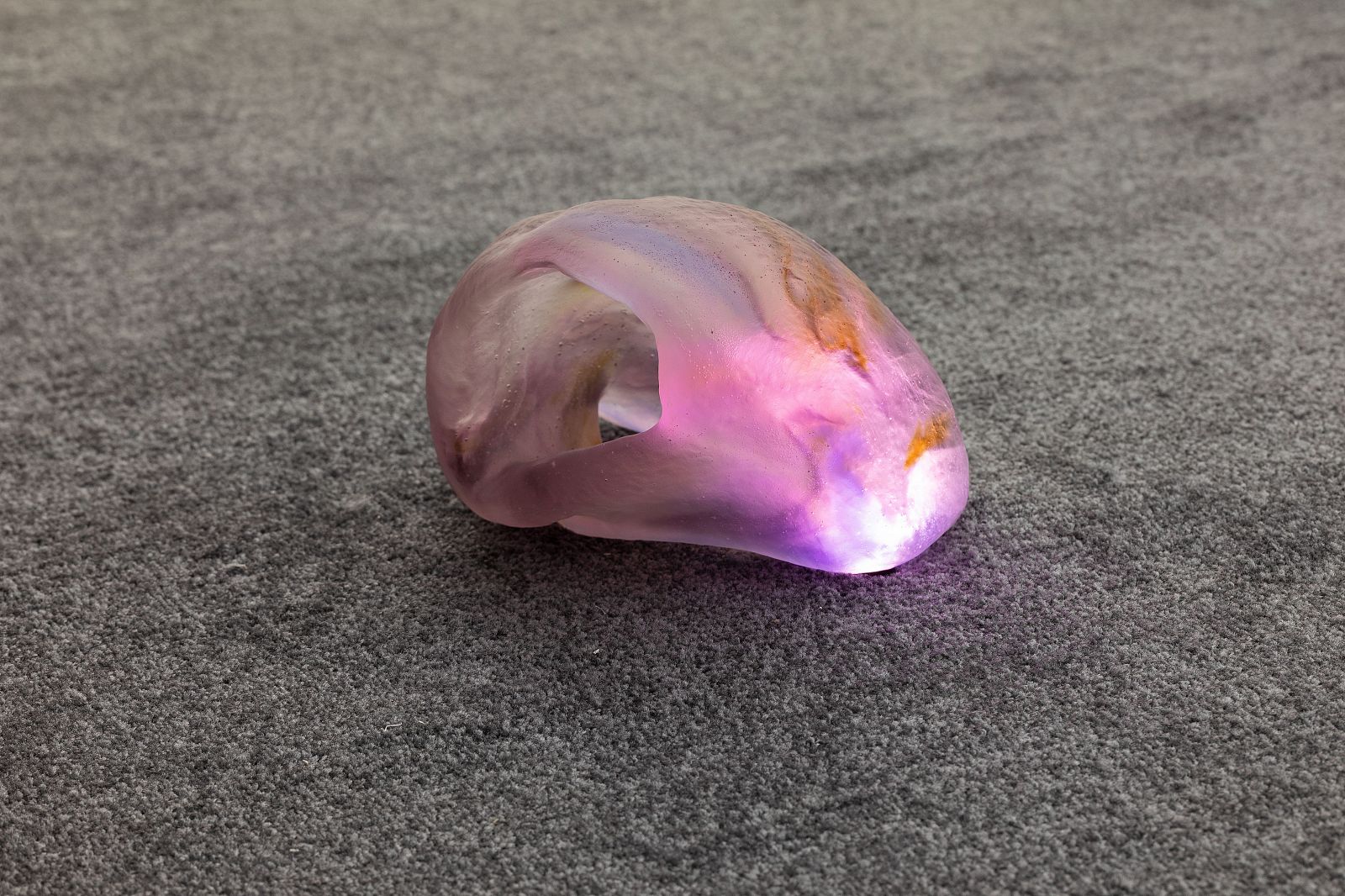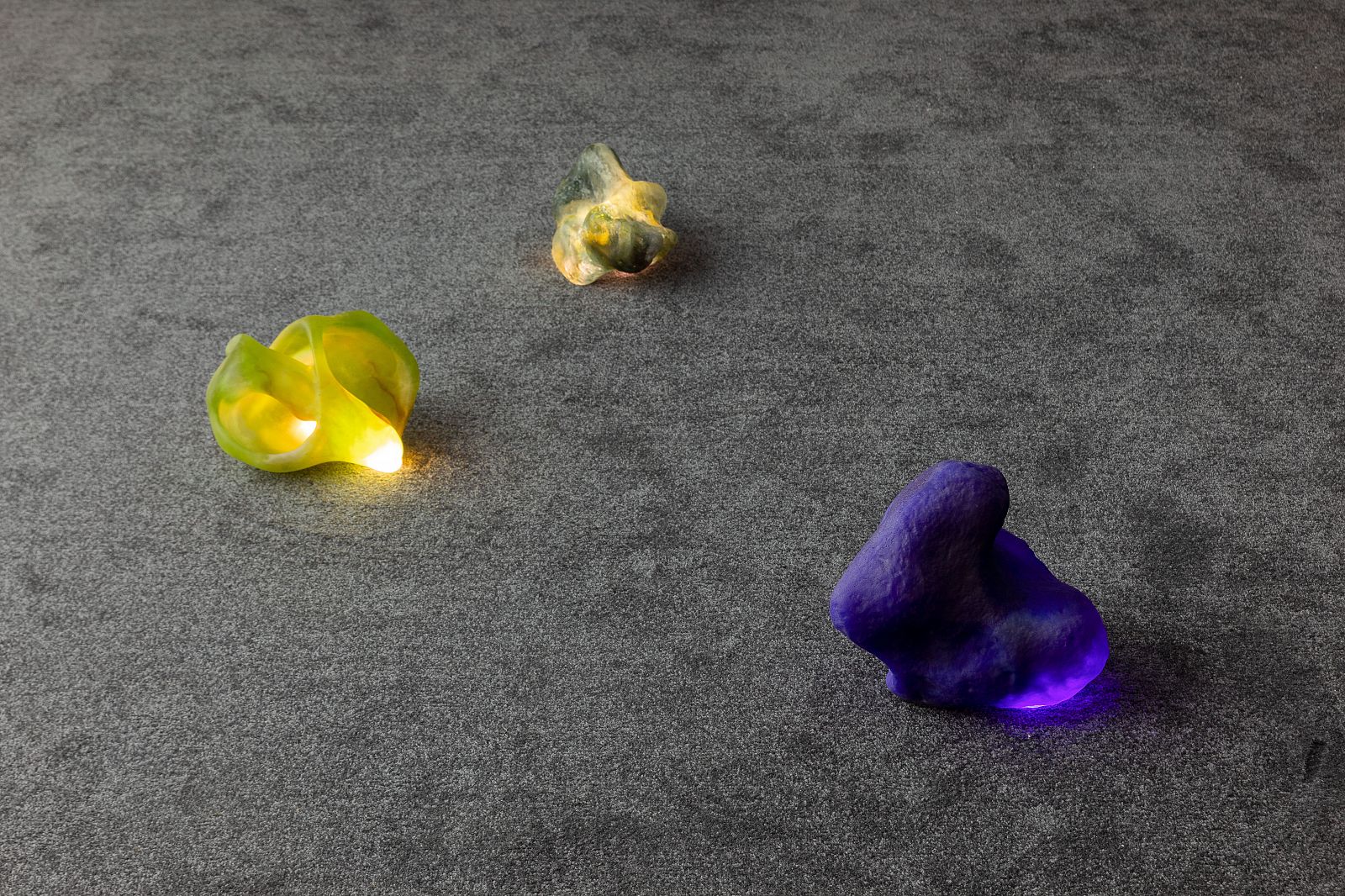 Hu Wei, Aquatic Invasion (No.1 - No.6), glass, crystal powder, refractory sand, clay, glaze, black iron, mineral pigments, LED light, 2021. Photo: Yang Hao