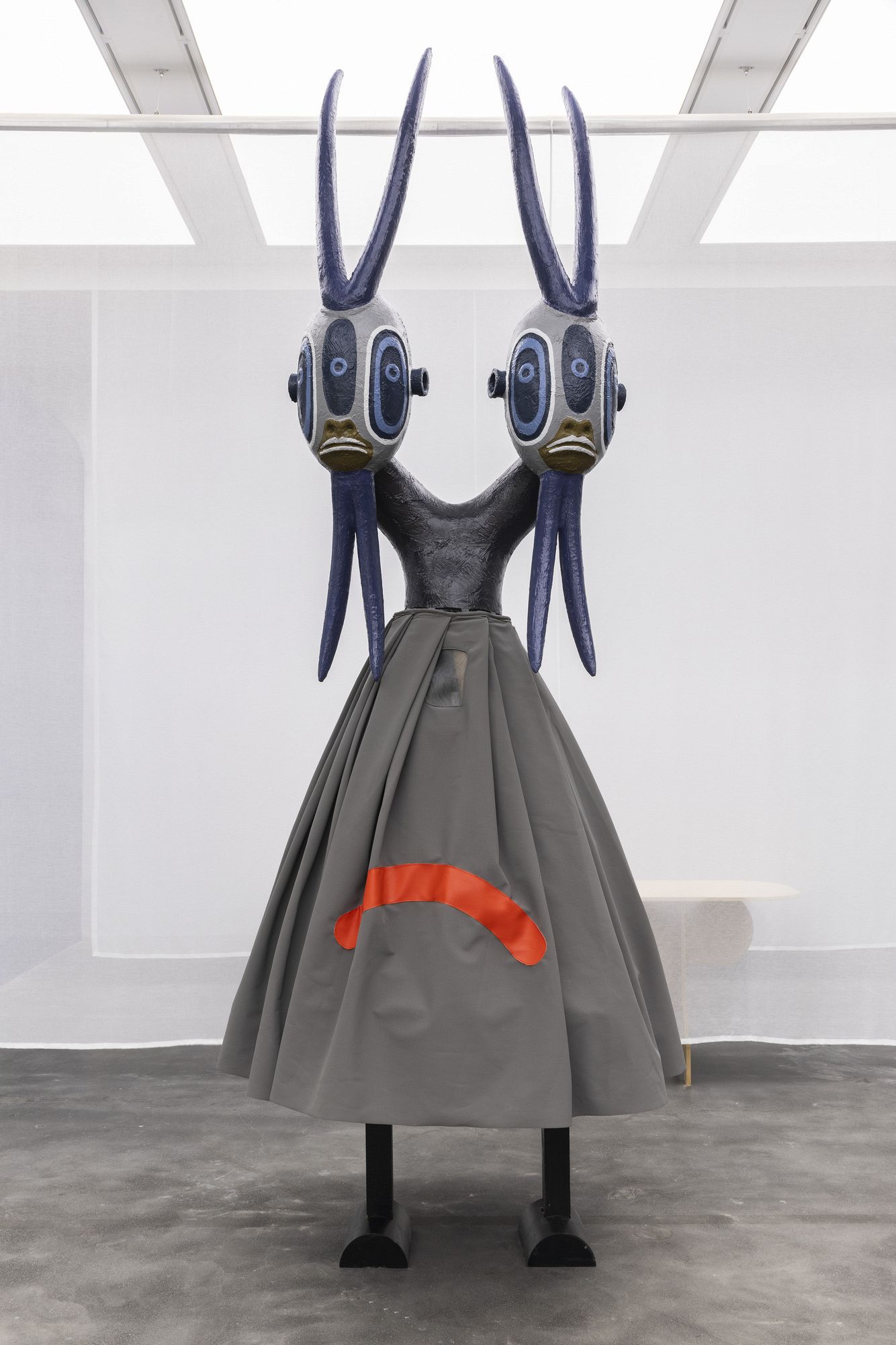 Lu Pingyuan, The Ancestor God of the Sheep, 2024, resin, polyurethane, lacquer, acrylic, artificial leather, wood, bamboo, 360×130×130 cm. Folk in Order, installation view, MACA, 2024. Photo: Yang Hao