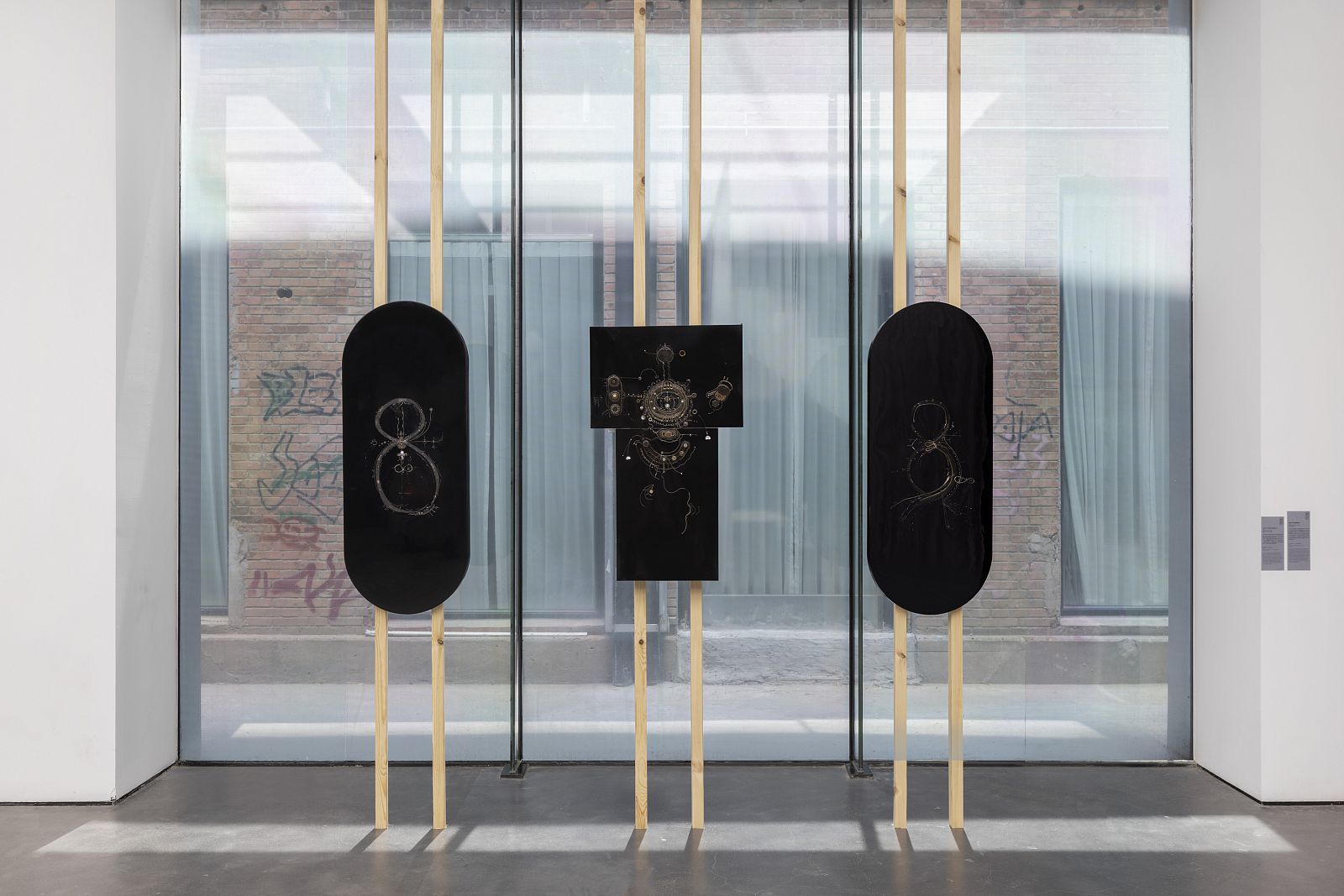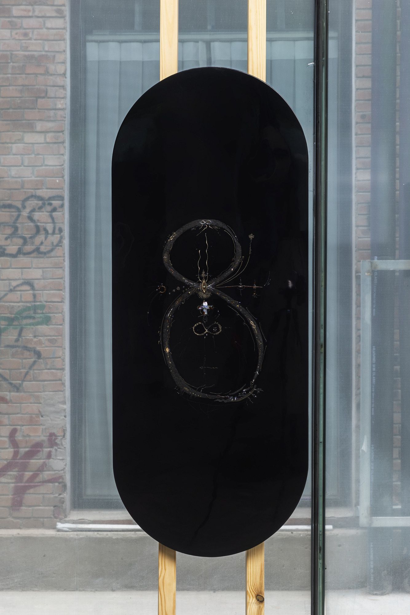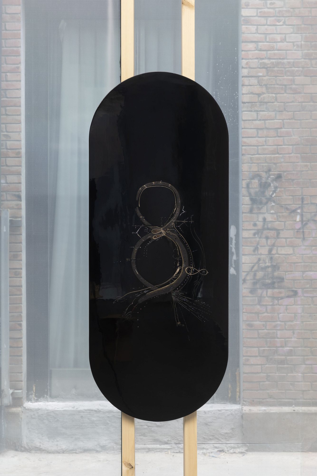 Pan Caoyuan, 8 (Tailed, Not Infinity), 2024, lacquer, mother of pearl, pearl, gold, silver, tin, 50×125×4cm each. Folk in Order, installation view, MACA, 2024. Photo: Yang Hao
