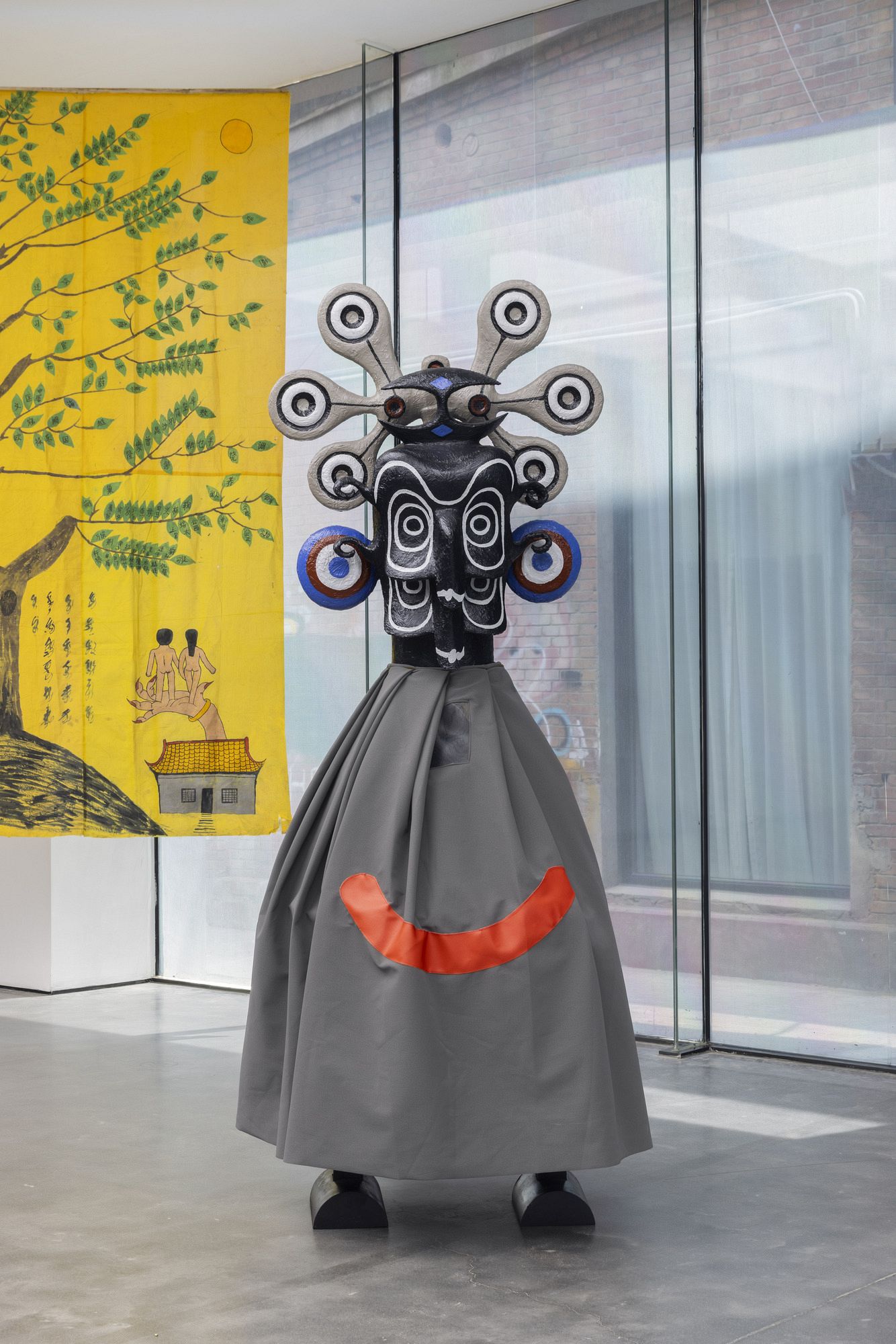 Lu Pingyuan, The God with Myriad Eyes #2, 2024, resin, polyurethane, lacquer, acrylic, artificial leather, wood, bamboo, 250×117×117 cm. Folk in Order, installation view, MACA, 2024. Photo: Yang Hao