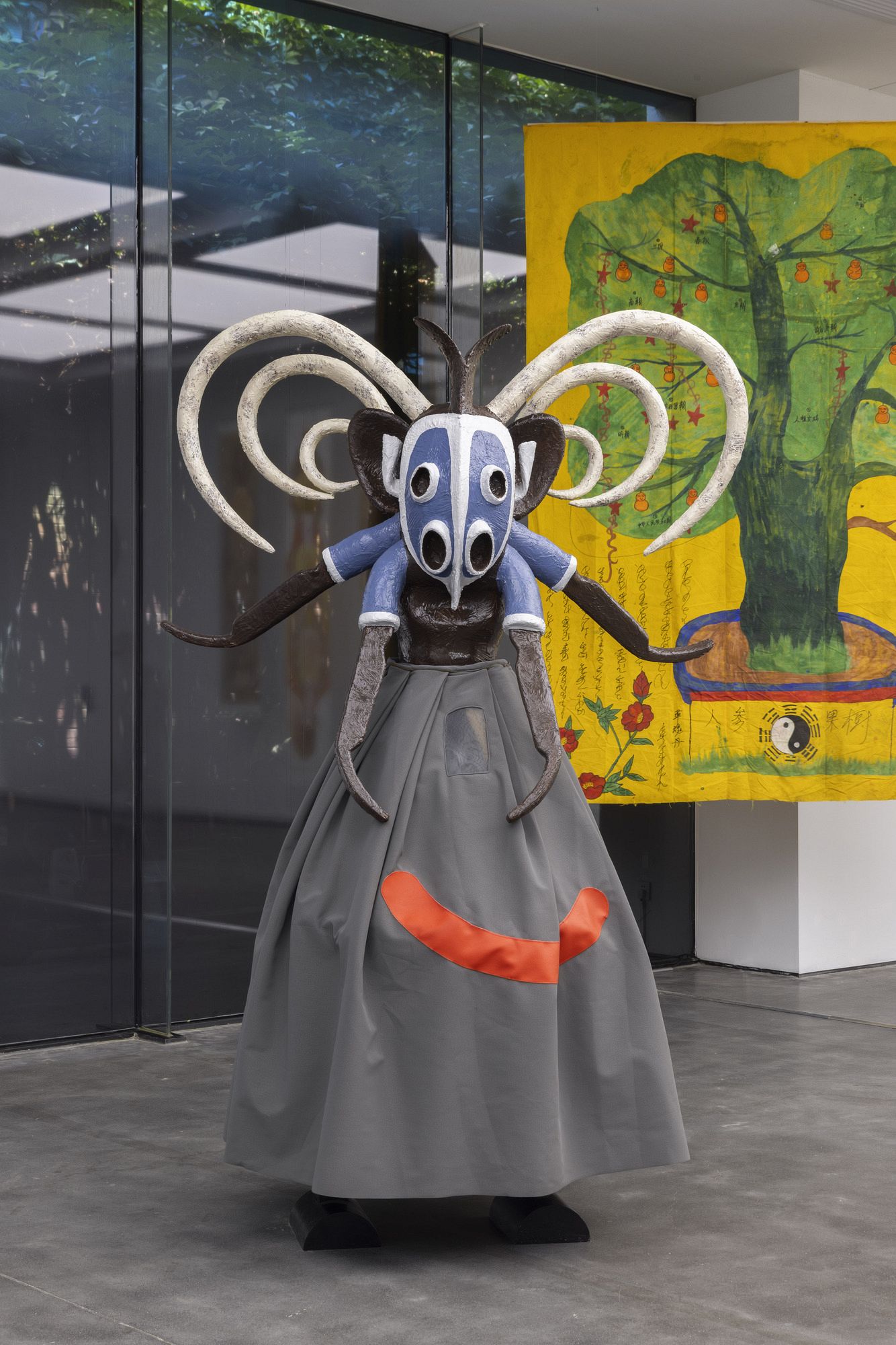 Lu Pingyuan, The Clawed Forefather of Executions, 2024, resin, polyurethane, lacquer, acrylic, artificial leather, wood, bamboo, 232×152×110 cm. Folk in Order, installation view, MACA, 2024. Photo: Yang Hao