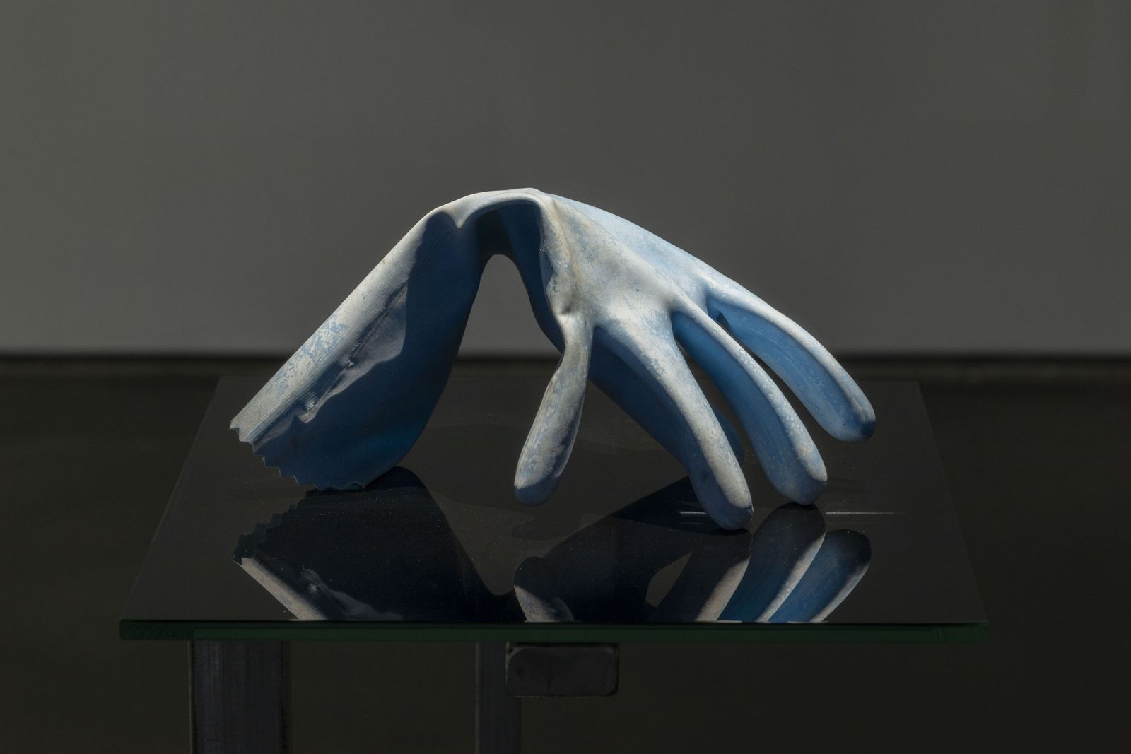 Dorota Gawęda and Eglė Kulbokaitė, Glove, 2025, rubber glove, aluminum wire, 29×14×14 cm. Spit and Image, installation view, MACA, 2025. Photo: Yang Hao