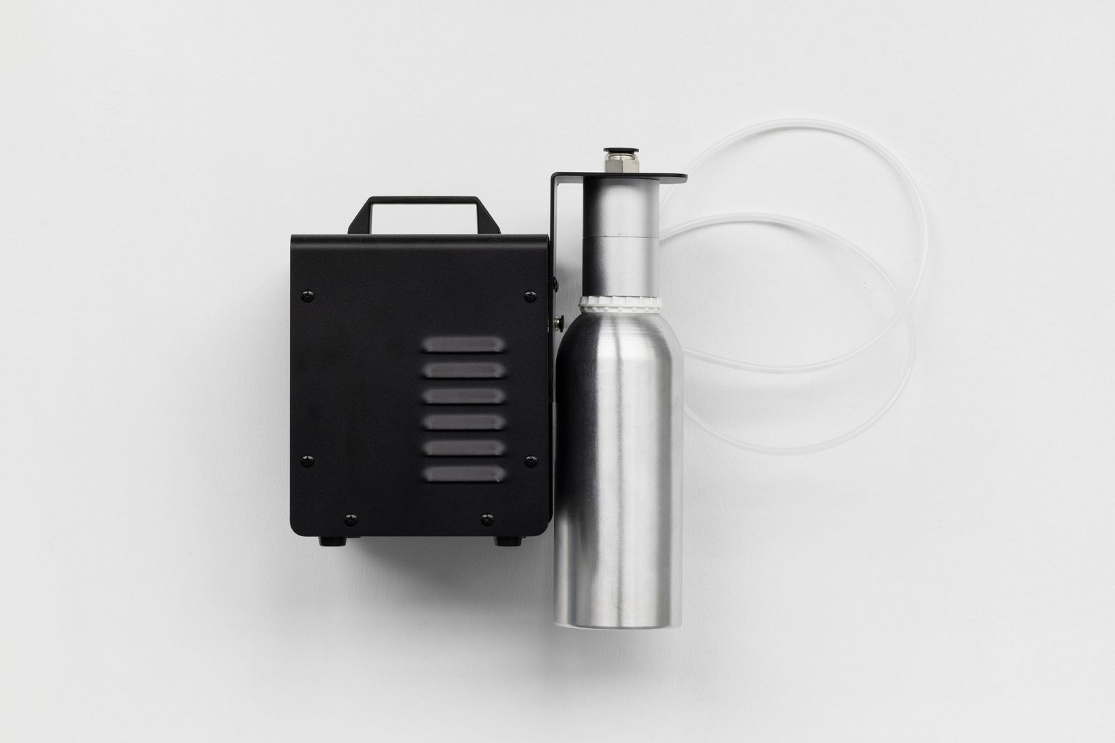 Dorota Gawęda and Eglė Kulbokaitė, Mirror Mirror, 2025, fragrances, industrial aroma diffusers, 17×16×19 cm each, 2 in total. Spit and Image, installation view, MACA, 2025. Photo: Yang Hao