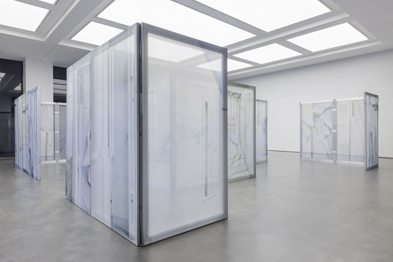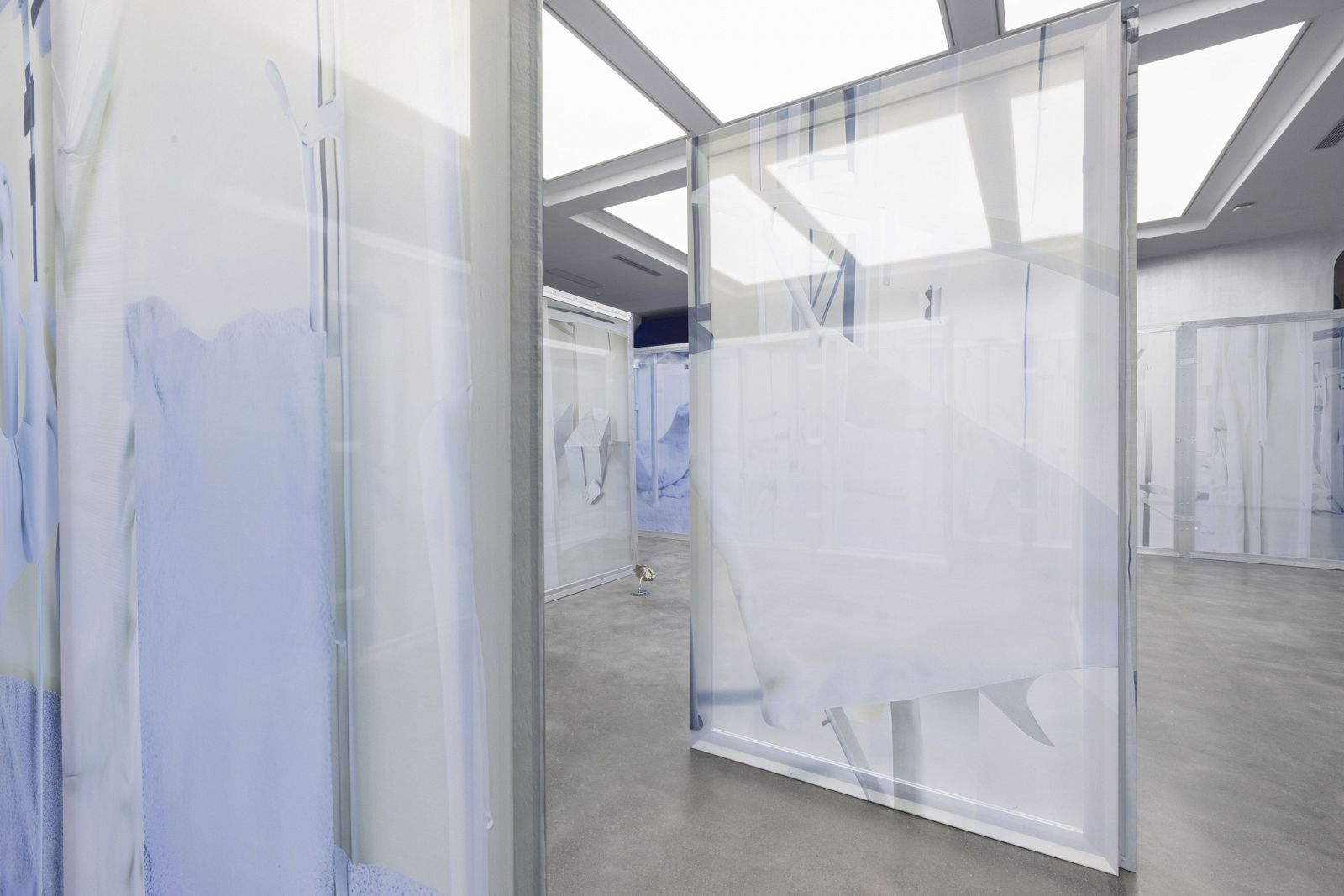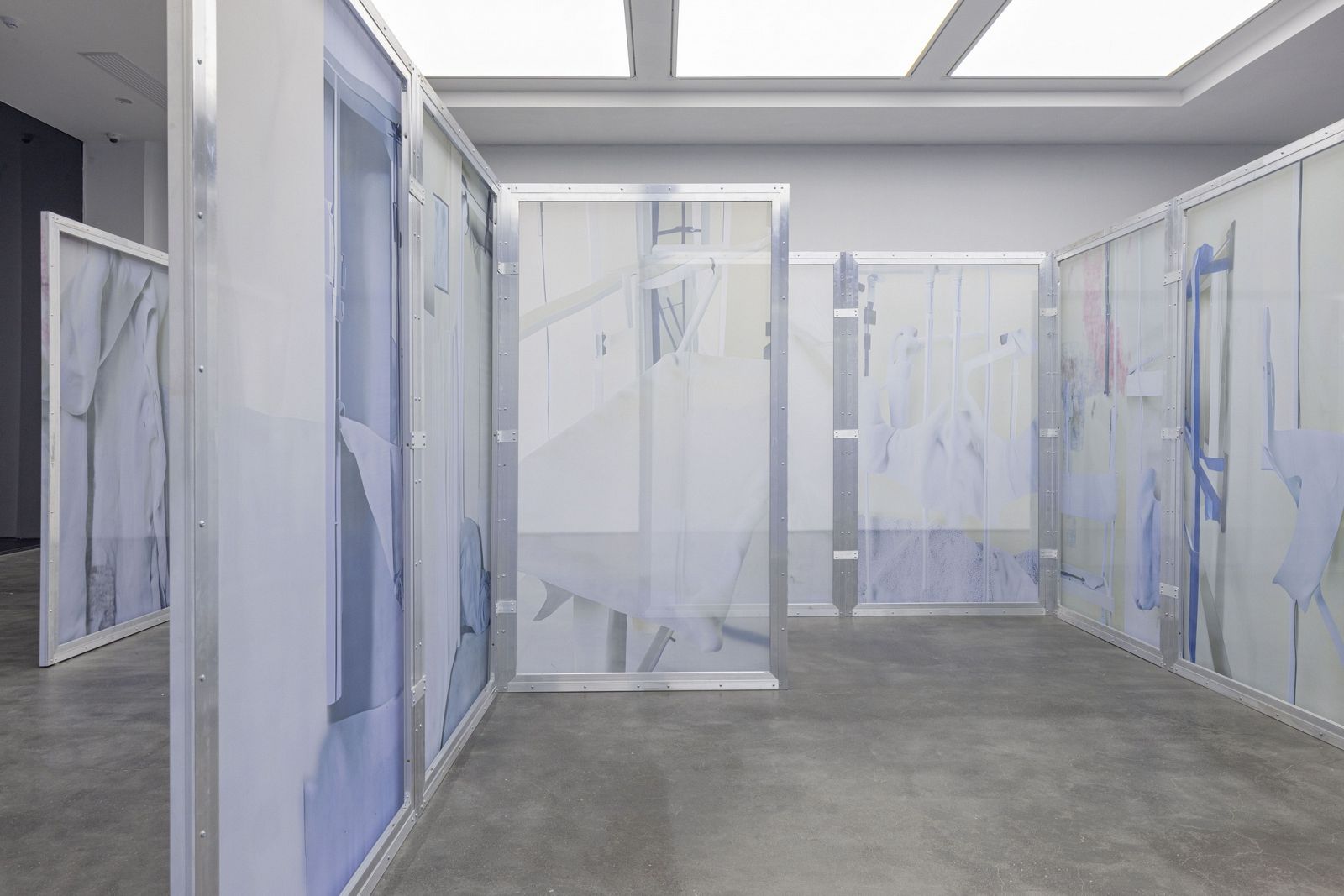 Dorota Gawęda and Eglė Kulbokaitė, Enclosure (The Double Dream of Spring) (I-XXVIII), 2025, aluminum frame, digital prints on textile, acrylic, 220×125×3.8 cm each, 28 in total. Spit and Image, installation view, MACA, 2025. Photo: Yang Hao