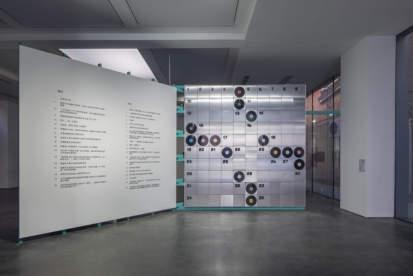 Maryam Jafri, Model 500, 2019, metal, vinyl LPs, plastic, vinyl text, 685×335 cm. TECHNO WORLDS, installation view, MACA, 2025. Photo: Yang Hao