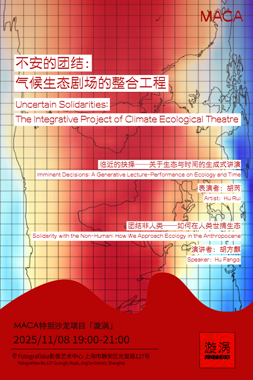 漩涡 2025.11.08 星期六 不安的团结:气候生态剧场的整合工程 在过去三年的实践中,“漩涡”以非制式化的表演创作或公众演讲穿插行径的方式,探索宏观或微观的、世界或中国的、集体或个人的议题,并制造“漩涡”一般高强度的现场体验。“再”挑战对于言说的重新起步。本次“漩涡”,一位艺术家和一位学者,将在同一场域内联袂展开一场气候生态剧场的整合工程。临场间,艺术创作与学术生产将细密地编织在一起,生成一处随机互文的超感“漩涡”。