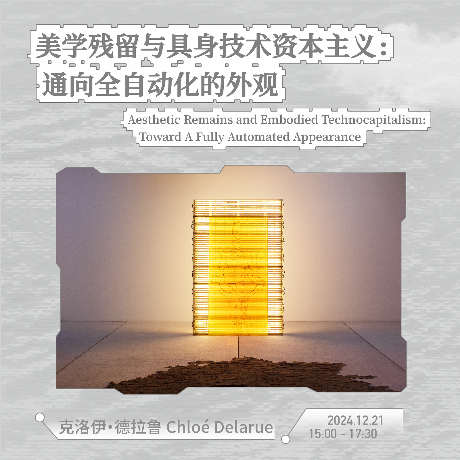 克洛伊·德拉鲁将带领我们回顾过去十年她创作的灵感来源,以揭示《TAFAA》的美学语言及其矛盾与暧昧之处。本次讲座的核心将触及一些开放性问题:自主系统和算法逻辑如何改变我们感知与存在的方式?我们能否想象现实的某种“完成时”或终极形态?我们是否面临个体感知和阐释世界的能力的衰退?围绕这些问题,克洛伊·德拉鲁坚持美学反思的可能性,以激发我们面对重大社会议题时的想象力。