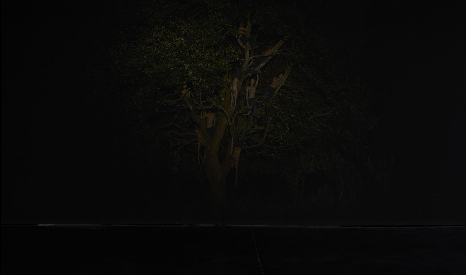 童文敏在此前对城市废墟的考察中,关注到野生植物的生存韧性,并开始收集生长于不同地域的植物。她通过漫长的日晒过程将这些植物纹印于自己的全身,仪式性地赋予身体以植物的灵性。展览中的六组影像作品记录了艺术家印晒有植物纹路的身体从云南西双版纳勐海县曼召村向北开启的一系列行为表演,夜晚爬到山里的树枝上,倒挂在颠倒的大树拂过土地,与人绞杀,在与一群人在火堆前感受温度原地旋转等等。这些近似放空的情景实则是艺术家在经历身体的适应、对本地知识的学习和对自然环境的考察后获得的影像结果,而这些前期准备亦可被看作是延时性的创作。艺术家的身体既是图像也是媒介,占据了出神与在场之间的临界空间,平衡不可避免的自我政治化的同时,在朴素神秘的层面中寻找意义。
